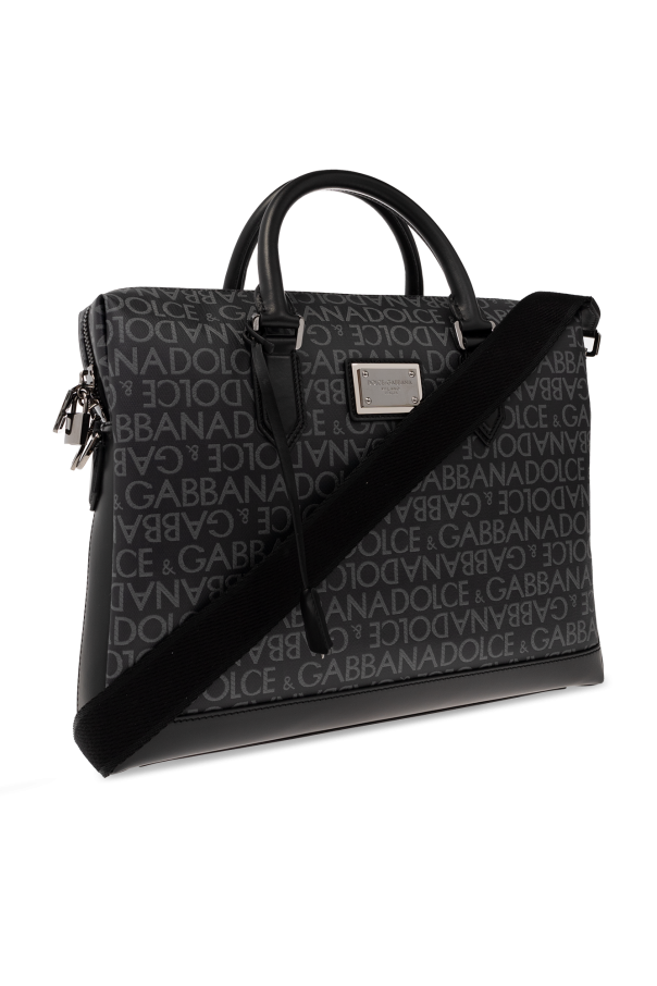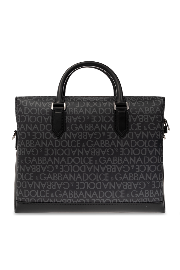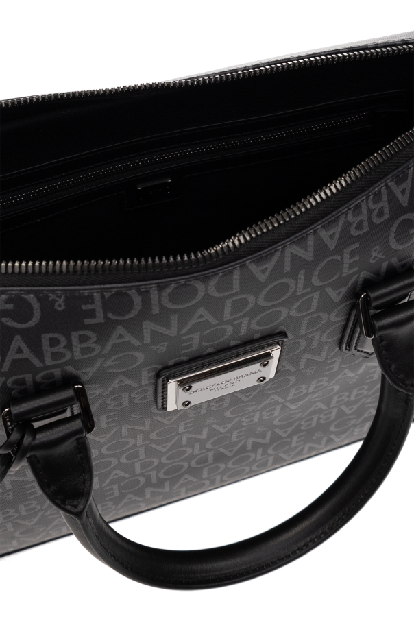 Black briefcase from Dolce & Gabbana. Crafted from monogrammed canvas and trimmed with leather, this design secures with a two-way zipper including a keyed padlock and showcases a logo application on the front. It is complete with a detachable and adjustable shoulder strap, two half-round handles, silver-tone metal hardware and one internal compartment with one zip pocket and two slip pockets.