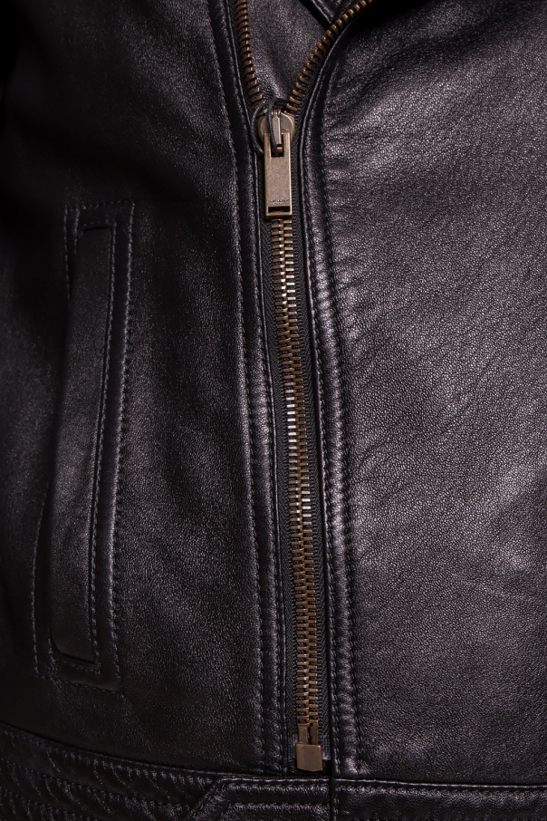 Black biker jacket from Saint Laurent. Made of sheepskin. Features zip and button fastenings and two slip frontal pockets.