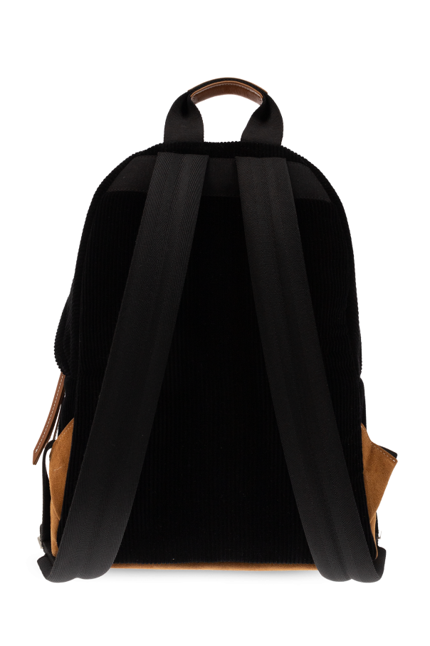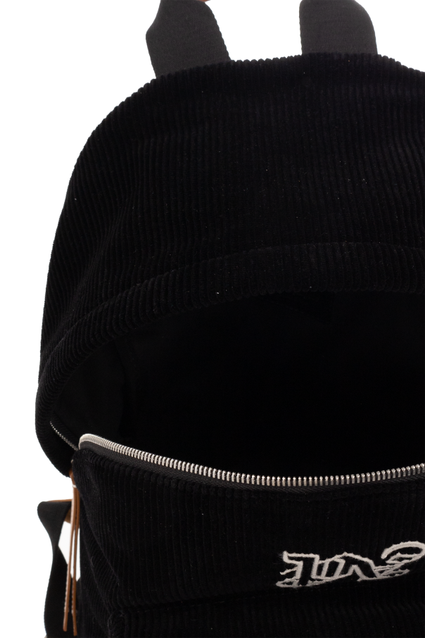Black backpack from Palm Angels. Crafted from cotton corduroy, this model features a zip fastening, cream logo embroidery, zipped front pocket, half-round handle, adjustable shoulder straps, one internal compartment and silver-tone metal hardware.