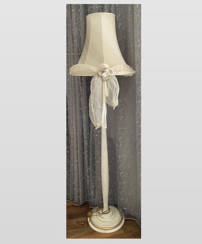 Торшер дерево, золотая и серебряная поталь по резьбе, шелковый плафон. Высота 185см. Диаметр плафона 50 см. Состояние нового, нет дефектов.