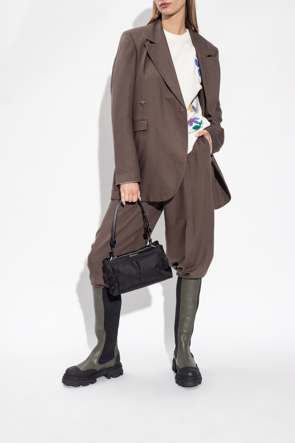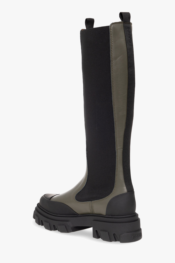 Green and black boots from Ganni. Sitting on a black rubber sole, this model features an almond-shaped toe, a black logo print at the back and elastic panels on the sides.