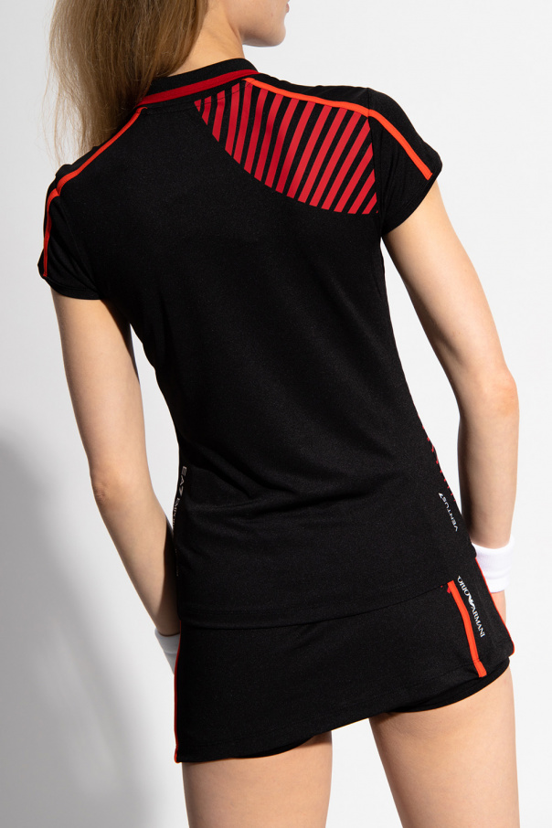 Black polo shirt from EA7 Emporio Armani. Crafted from a stretch knit, this style showcases a print with the brand's logo in white and a graphic motif in red.