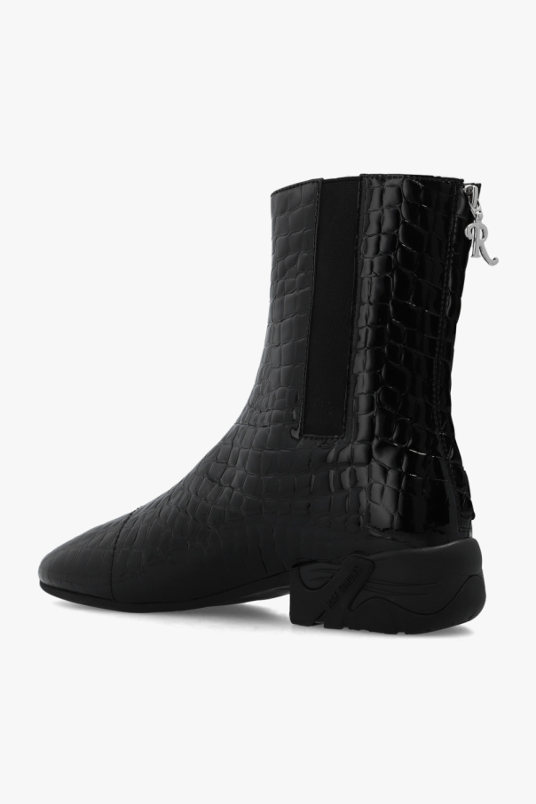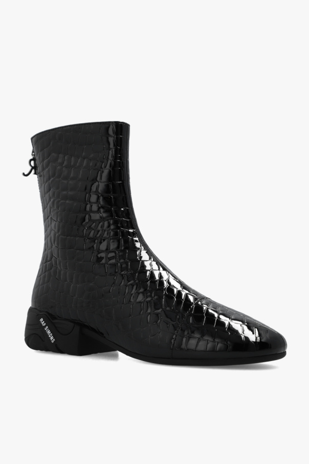 Black ‘Solaris’ heeled ankle boots from Raf Simons. Crafted from patent leather with a crocodile skin effect, this model sits on a black rubber sole and showcases a back velcro closure, logo detailing and elastic panels on the sides.