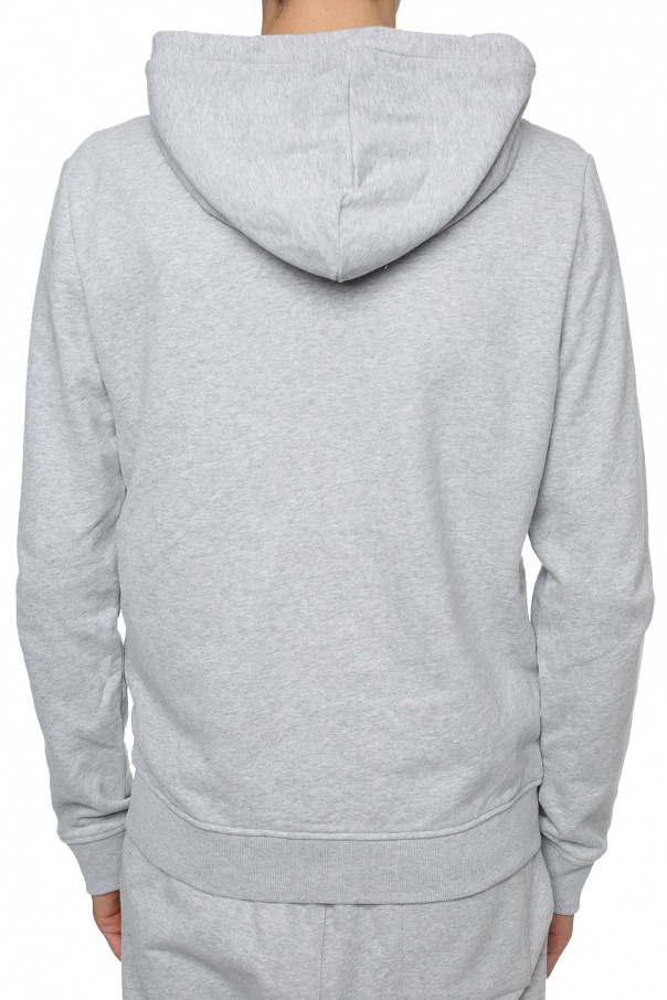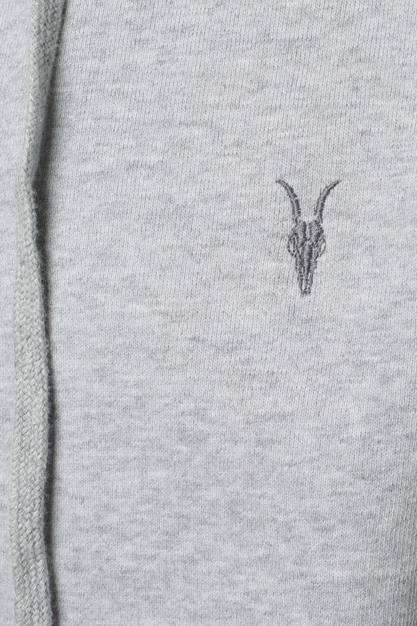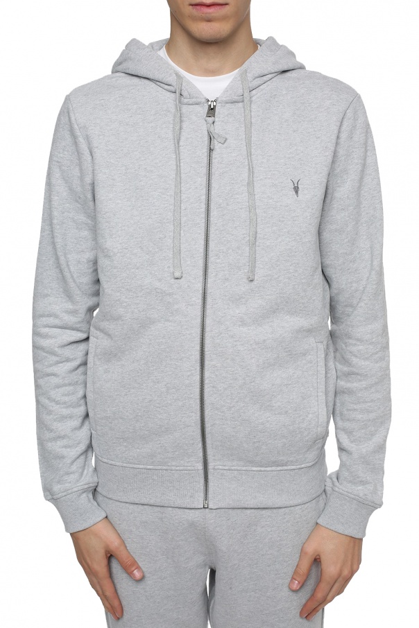 Grey cotton 'Raven' sweatshirt from AllSaints. Zip fastening. Hood with drawstrings. Embroidered logo. 2 slip pockets at front. Elasticated hem and cuffs. Antiqued silver-tone metal hardware.