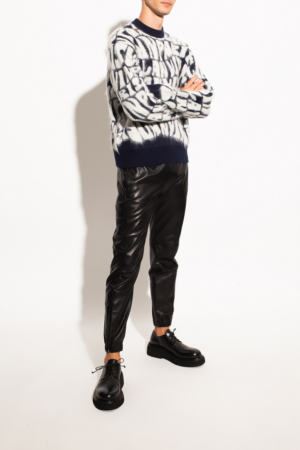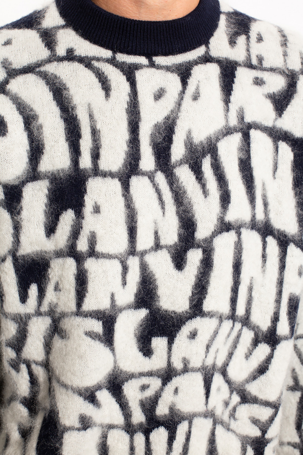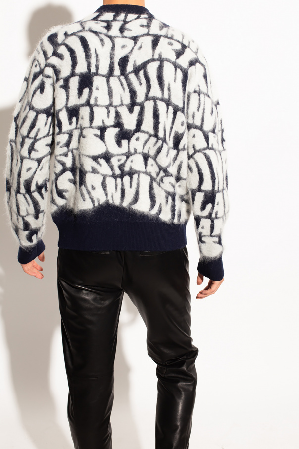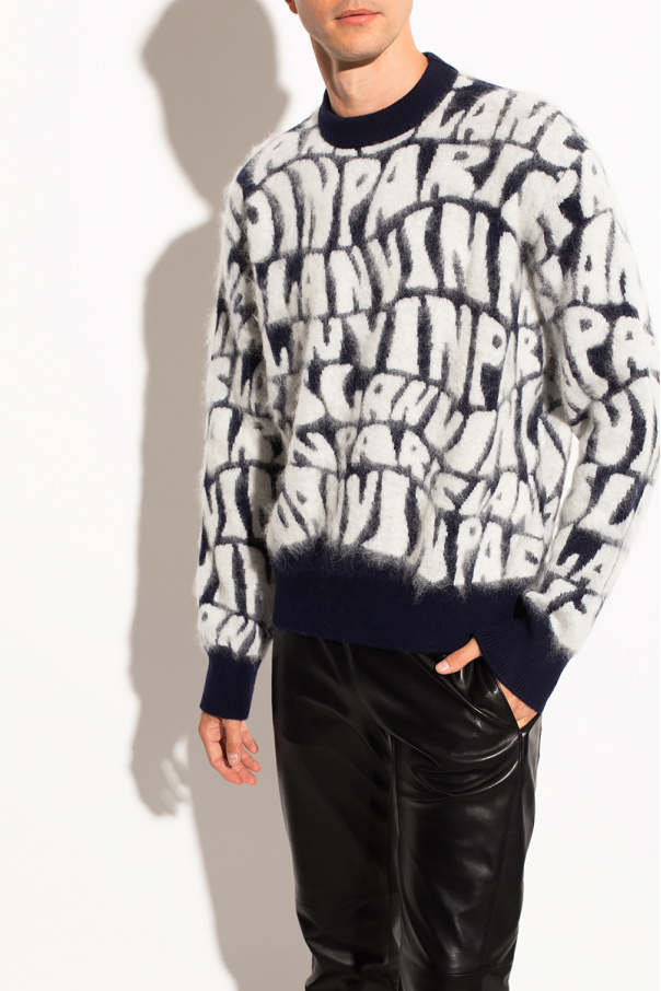 Navy blue and white crewneck sweater from Lanvin. Knitted from a wool and mohair blend, this jumper showcases a logo pattern for brand recognition.
