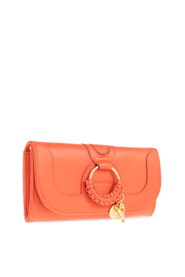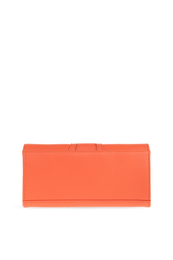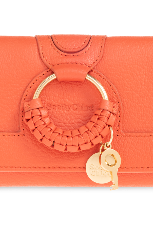 Orange wallet from See By Chloe. Made of leather, this design features a snap closure, embossed logo, round element with woven details and charms, gold-tone metal hardware and one internal compartment with one zipped partition, one slip pocket and twelve card slots.