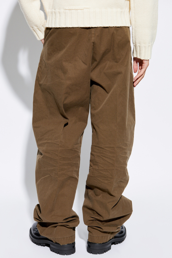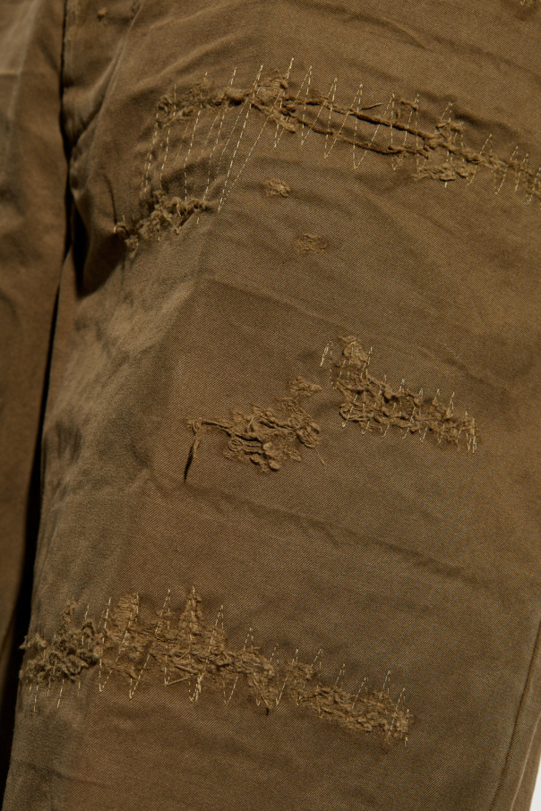 Introducing the Distressed Pants by the illustrious Dsquared2, an embodiment of casual sophistication and modern elegance. Crafted from 100% premium cotton, these brown-hued trousers merge comfort with rugged style, offering a unique sartorial experience. Featuring a straight, loose fit, these pants are adorned with artfully placed distressed details and frayed edges, predominantly located on the upper front and along the legs. Reinforced stitching accentuates these stylistic elements, ensuring durability and a distinctive look. The pants are equipped with a convenient button and zipper closure, and boast a classic pocket configuration with two front and two back pockets. Their full-length design gracefully falls to the ankles, making them an ideal companion for casual ensembles, perfectly paired with cozy sweaters or stylish jackets. Why Choose This Product? Expert craftsmanship by Dsquared2, a brand renowned for blending American glamour with Italian sophistication. Distinctive distressed design that adds a fashionable edge to your wardrobe. High-quality 100% cotton fabric ensures comfort and longevity. Versatile styling options suitable for various casual occasions.