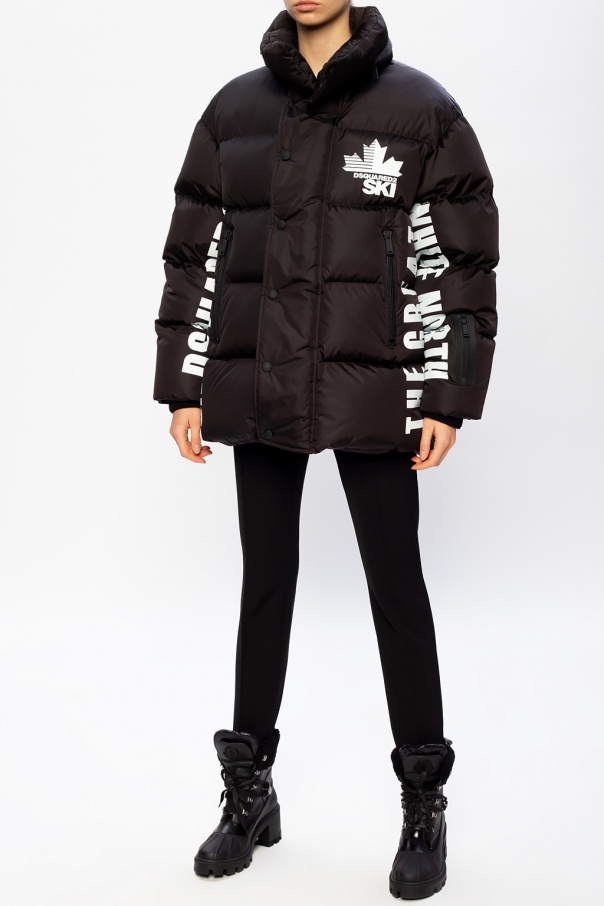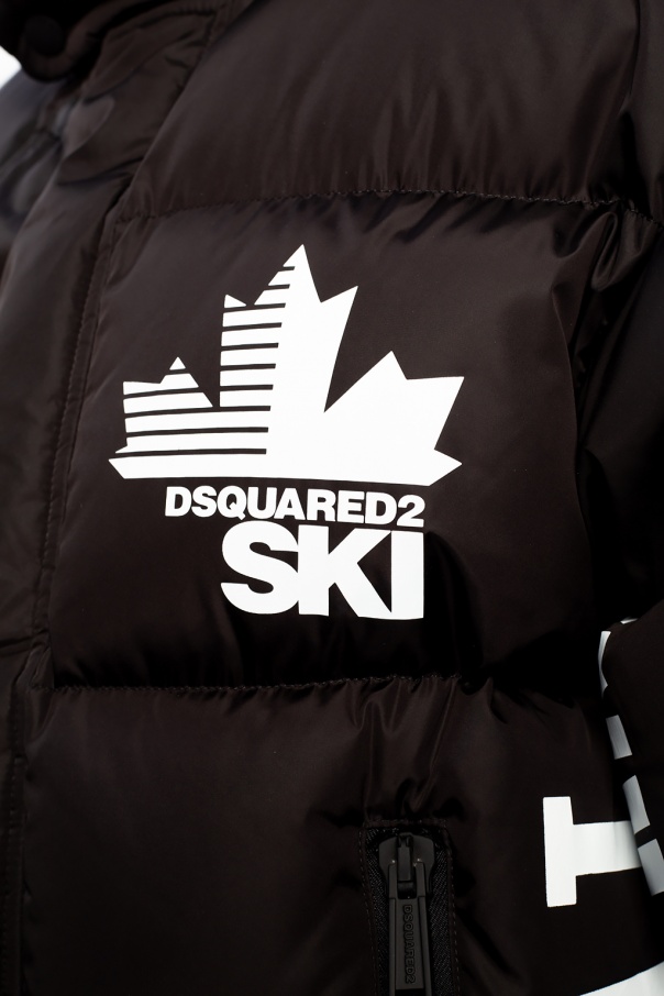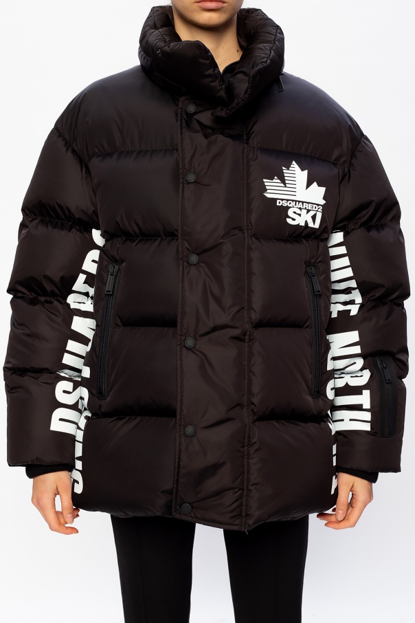 Black quilted down jacket from Dsquared2. Fastened with a two-way zip and snaps, this garment features a concealed hood, printed logo pattern in white, long sleeves with ribbed cuffs and two front zip pockets.