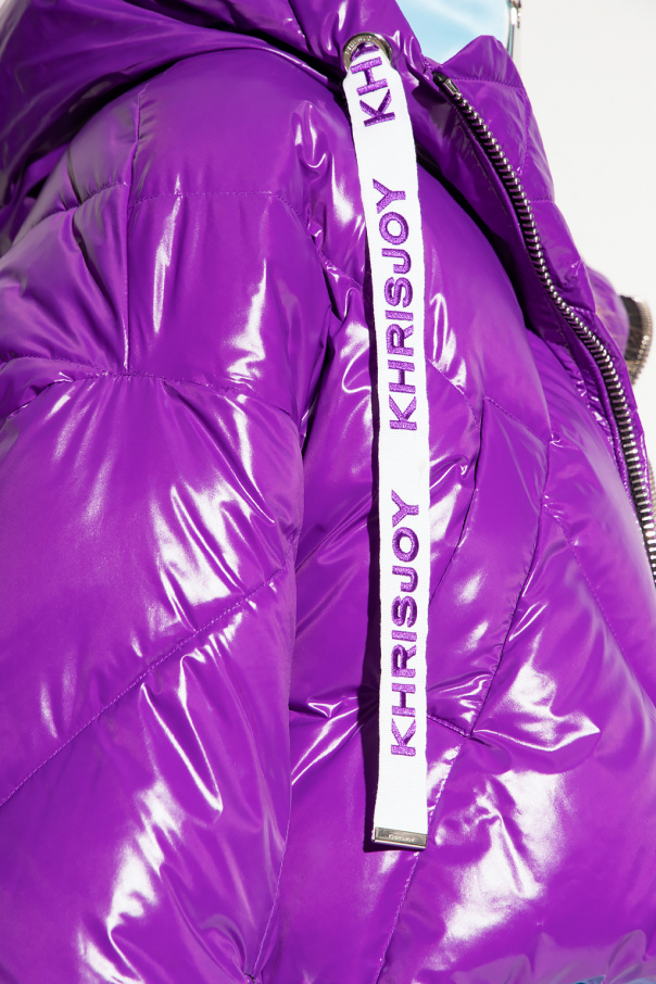 Purple down jacket from Khrisjoy. Crafted with a cropped, oversize silhouette, this style features a zip fastening, two frontal pockets, long sleeves with zip cuffs and a bottom hem and hood cinched with signature branded drawstrings.