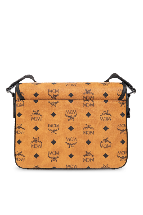 Brown shoulder bag from MCM. Crafted from the brand's signature Visetos canvas decorated with a black logo, this design features a strap with a snap closure, a metal logo plaque on the front, a back slip pocket, an adjustable shoulder strap and one internal compartment with one one slip pocket and one zip pocket.