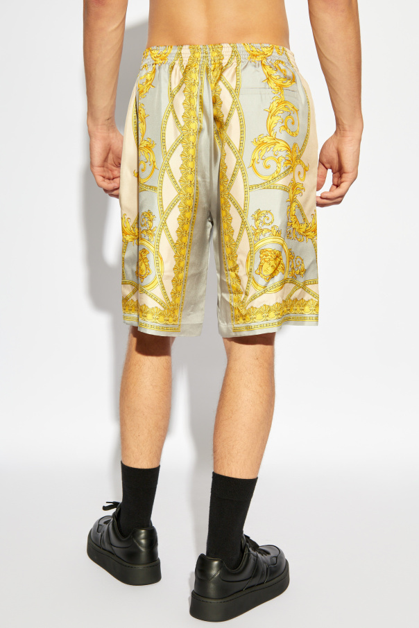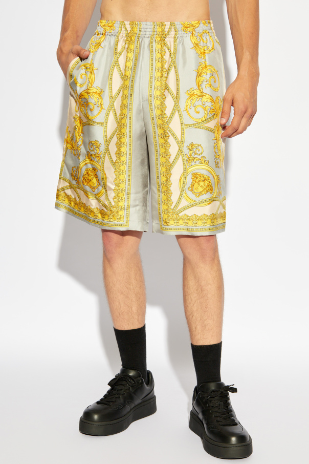 We present the exceptionally elegant men's silk shorts from the renowned brand Versace, epitomizing luxury and sophisticated style. These shorts feature a classic, loose fit with straight legs that reach just above the knee. Made from the highest quality silk, the shorts boast a delicate sheen that underscores their exclusive character. The unique Barocco pattern, consisting of intricate golden ornaments and botanical motifs, covers the entire surface of the shorts, creating a rich, baroque effect. The dominant beige color perfectly complements the golden accents, giving the whole piece exceptional elegance. The shorts have an elastic waistband for comfortable wear and practical side pockets. Meticulously finished with attention to the smallest details, they exemplify the best of Italian craftsmanship. Why buy this product? Made from the highest quality silk, giving them a luxurious look and delicate sheen. Unique Barocco pattern that highlights elegance and sophisticated style. Elastic waistband for comfortable wear. Practical side pockets. Meticulously finished with attention to detail, emphasizing their exclusivity. A product from the renowned brand Versace, known worldwide for innovative and luxurious designs.