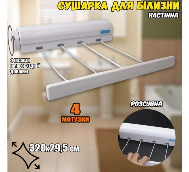29.5см×3.2мАвтоматична мотузка для білизни використовується для сушіння білизни на балконі, у ванній кімнаті, на кухні або в будь-якому зручному місці. Сушарка для білизни має фіксатор, завдяки якому мотузки розтягуються на потрібну відстань (максимальна відстань 3,2 метри).