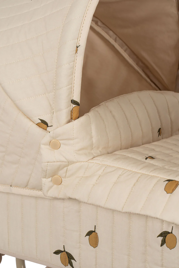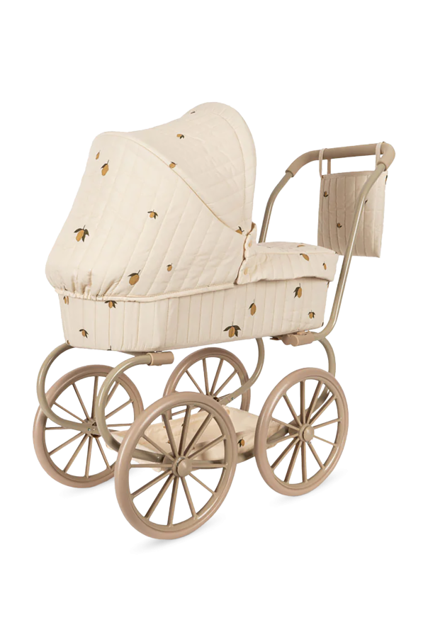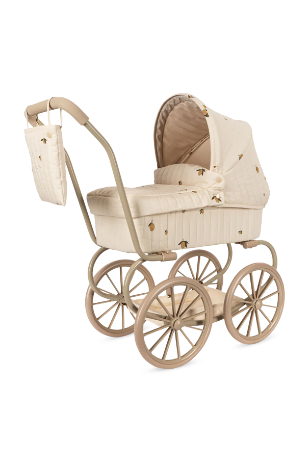 Introducing the Doll's Pram from the illustrious Konges Sløjd, a paragon of elegance and functionality. This exquisite piece, enveloped in a creamy hue adorned with delicate lemon motifs, epitomizes charm and sophistication. Crafted from quilted cotton and fortified with a sturdy steel frame, the pram boasts an impeccably stable construction. Its large wheels ensure effortless maneuverability, exuding a timeless, vintage allure. Functionality meets style with a matching bag attached to the handle, while the pram's interior is luxuriously lined, harmonizing with its exterior. It also features a soft mattress and a padded storage basket beneath, providing both comfort and practicality. Designed with meticulous attention to detail by Emilie Konge, this pram is a testament to sustainable craftsmanship, utilizing environmentally friendly materials. Why Choose This Product? Elegant, vintage-inspired design with a unique lemon pattern. Crafted with sustainable, high-quality materials. Equipped with large wheels for smooth and stable strolling. Comes fully assembled with easy folding and storage capabilities. Includes a soft mattress and padded storage basket for added convenience.
