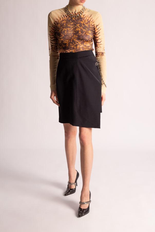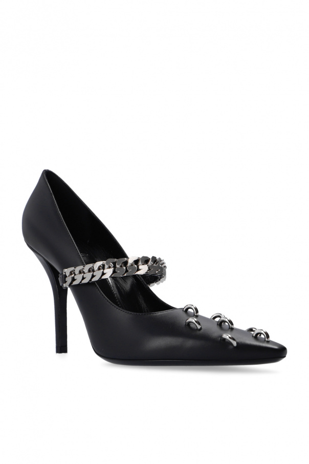 Black stiletto pumps from Givenchy. Made of leather, this pair is set on a black leather sole and embellished with decorative metal details and chain in silver-tone.