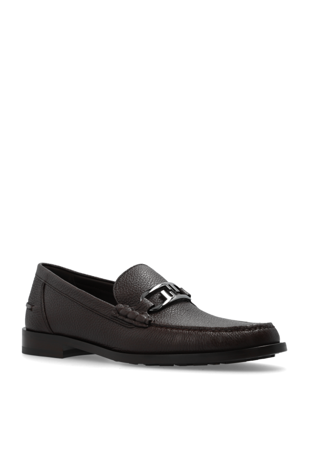 Brown ‘O’Lock’ loafers from Fendi. Made of grained leather, this pair features a dark silver-tone metal logo detail and a brown sole in leather and rubber.