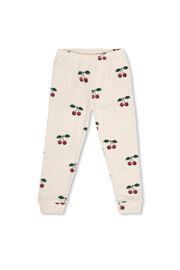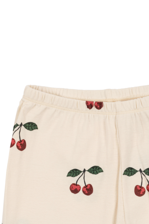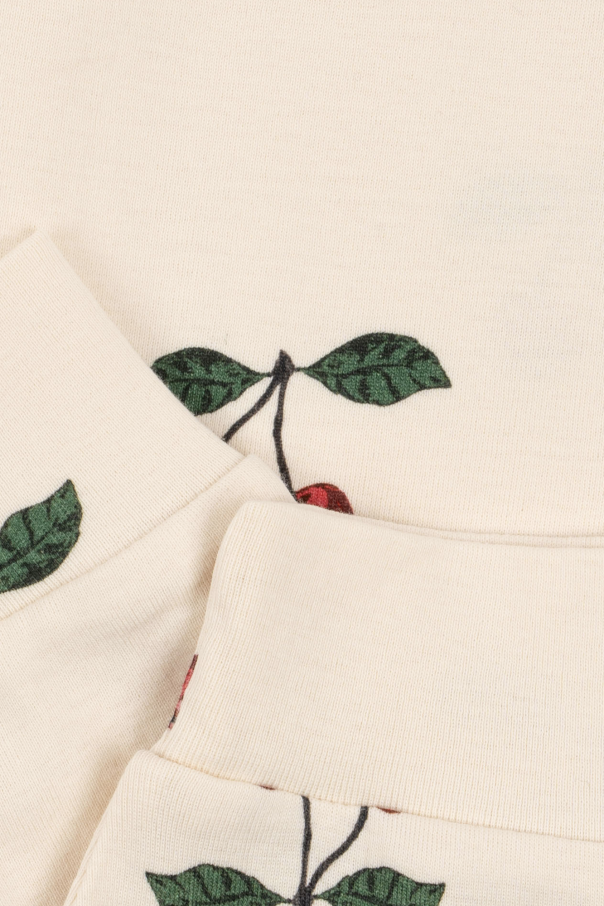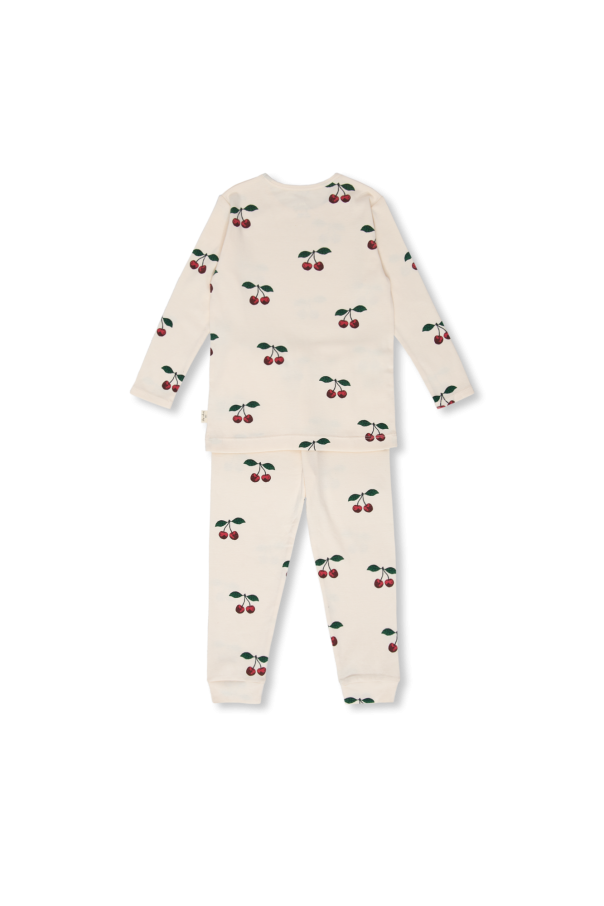 Beige two-piece pyjama from Konges Slojd. Made from organic cotton, this style showcases a cherry motif. It includes a crewneck top with long sleeves and bottoms featuring an elasticated waistband and cuffs.