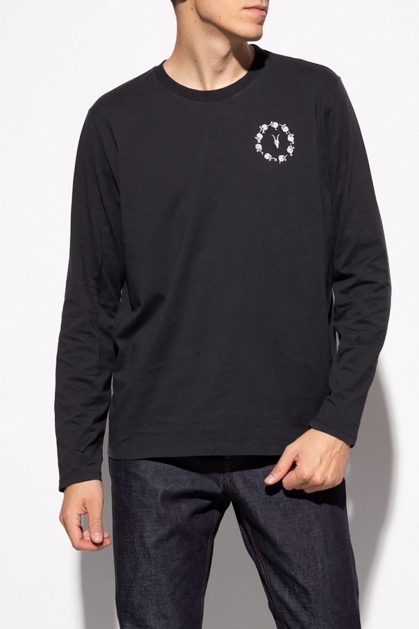 Black ‘Bunch Brace’ crewneck T-shirt from AllSaints. Crafted from cotton, this style showcases long sleeves and a white graphic print accompanied by the signature Ramskull embroidery.