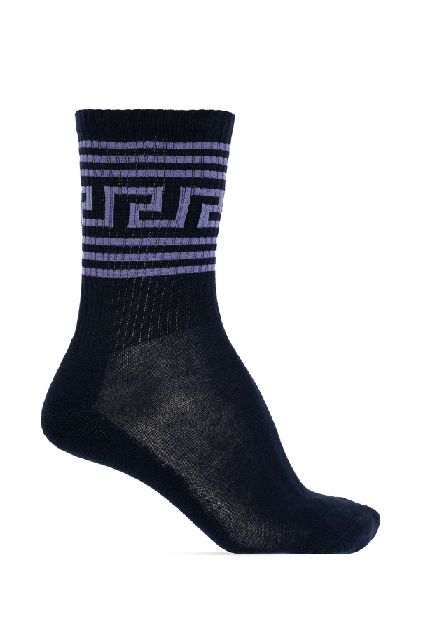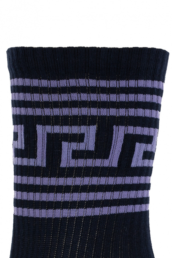 Navy blue and purple socks from Versace. Crafted from a stretch cotton blend, they showcase the brand's signature Greek pattern.