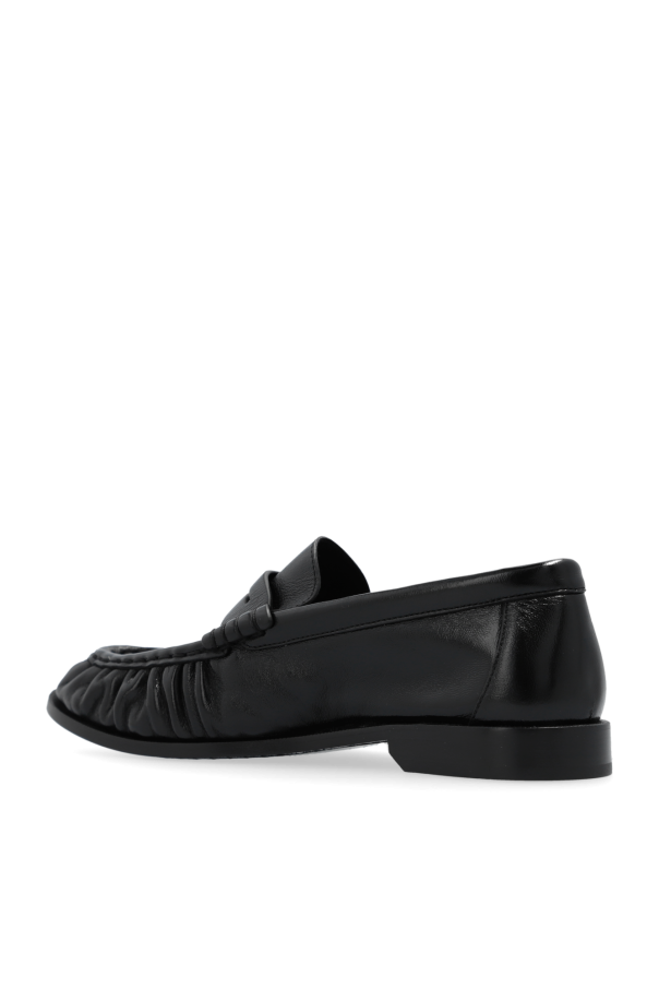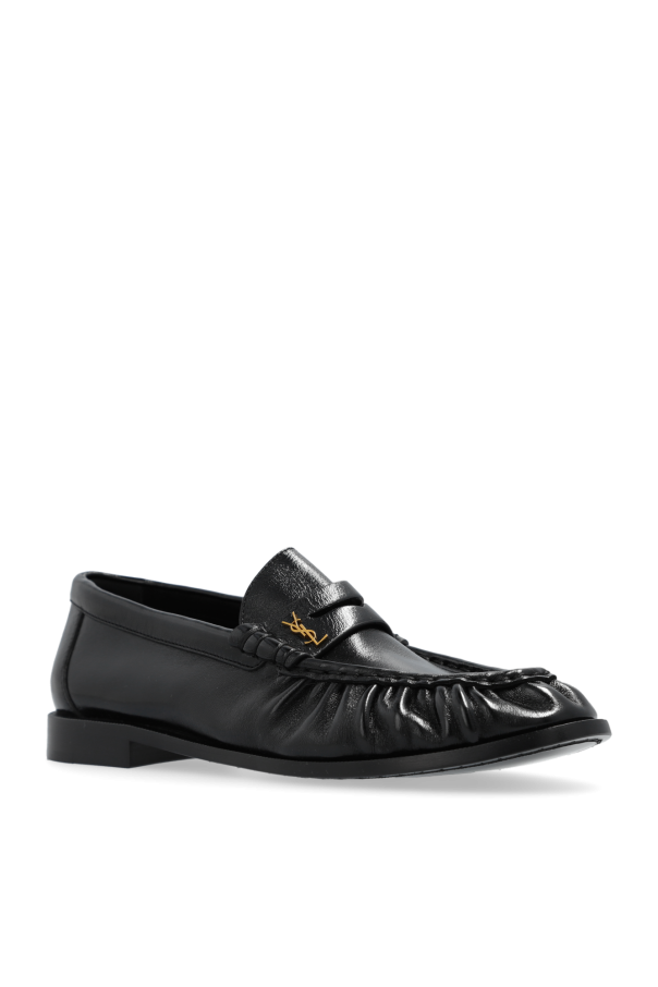 Black loafers from Saint Laurent. Made of leather, this draped pair features a logo detail and a black leather sole.