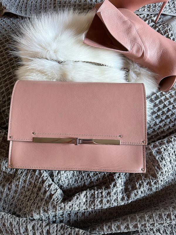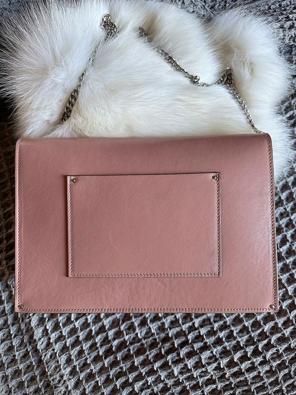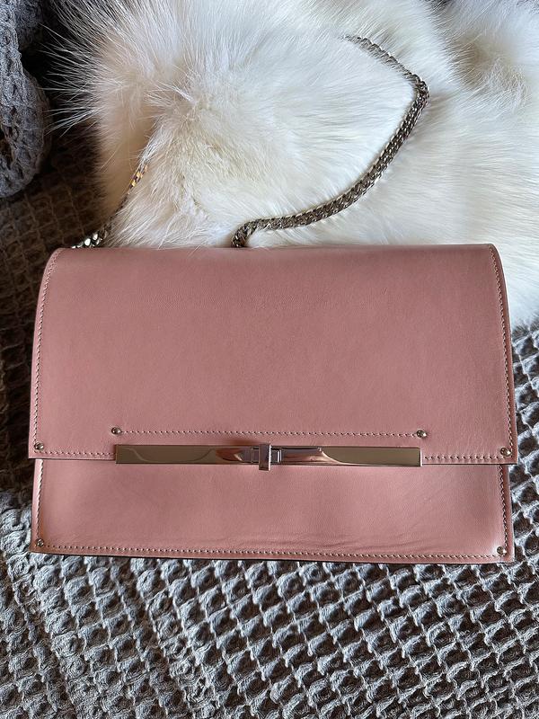 Минималистичный клатч от итальянского бренда Casadei, сделан из натуральной кожи. Снаружи сумка обладает нежным пудрово-розовым оттенком, внутри же этот цвет приобретает оттенок розового золота. У сумки одно большое отделение с двумя маленькими кармашками, серебристая фурнитура и серебристая цепочка, которую можно отстегнуть.