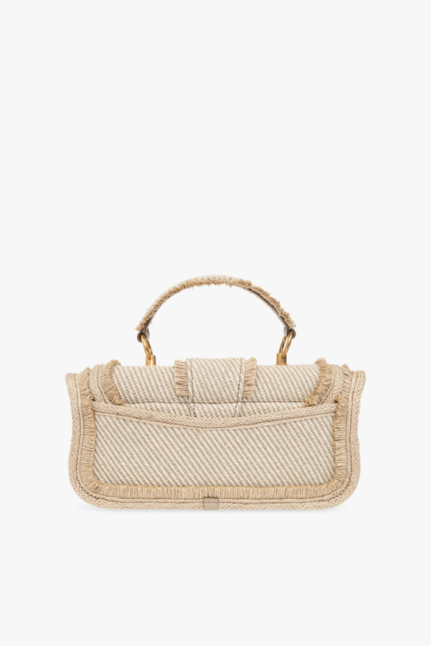 Beige shoulder bag from Balmain. Made of linen, this model features a snap closure, logo detail, half-round handle, adjustable shoulder strap, gold-tone metal hardware and one internal compartment with one slip pocket.