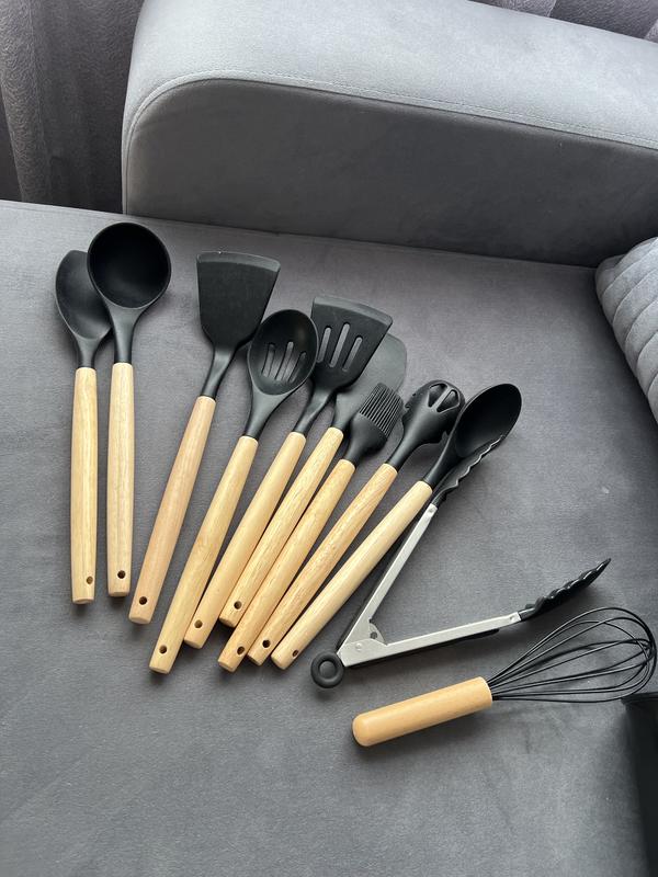 Набор кухонных приборов с силиконовыми наконечниками, безопасный набор кухонных приборов для готовки, набор кухонных приборов с деревянной ручкой, моющая современная посуда