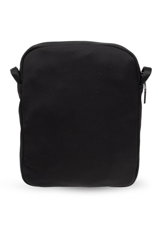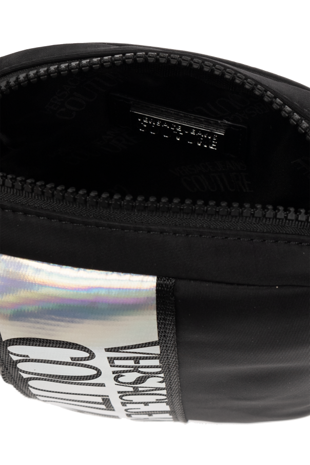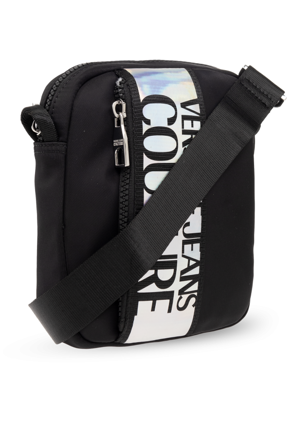 Black shoulder bag from Versace Jeans Couture. Crafted from fabric, this model fastens with a zip and is decorated with a holographic stripe and a logo. It also has a zipped front pocket, detachable and adjustable strap, one internal compartment and gold-tone metal hardware.