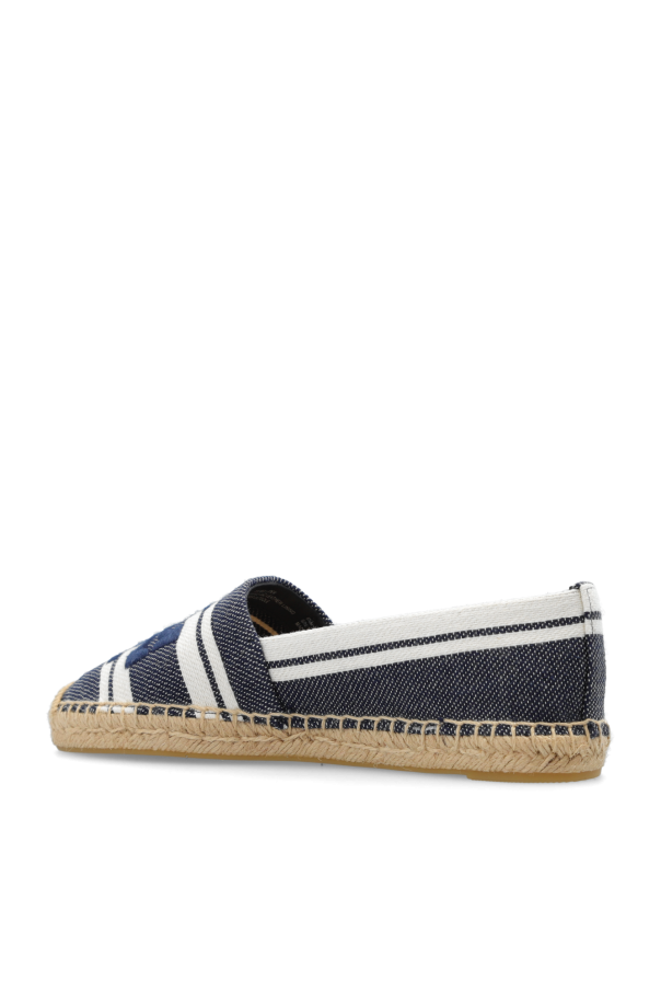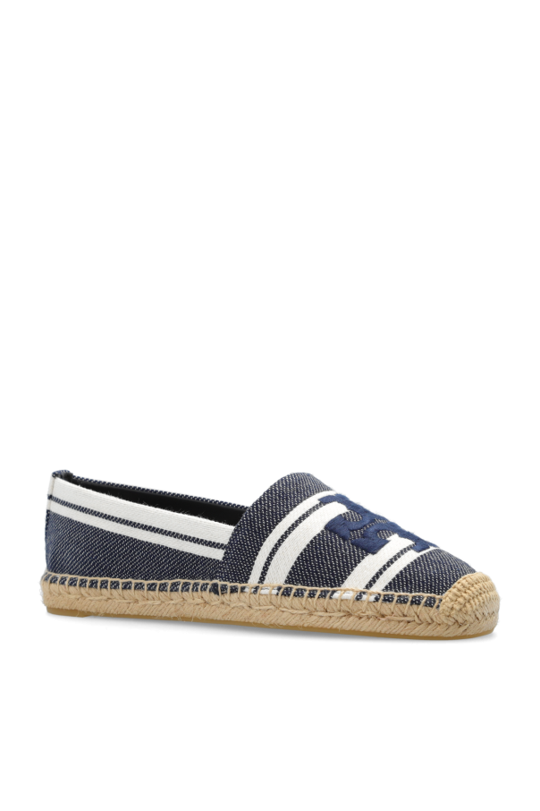 Navy blue and cream espadrilles from Tory Burch. Made of canvas, this model sits on a woven jute sole with a rubber trim and showcases a stripe motif and logo embroidery.