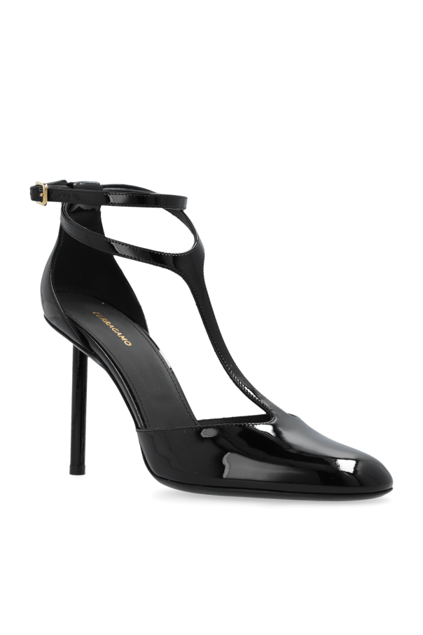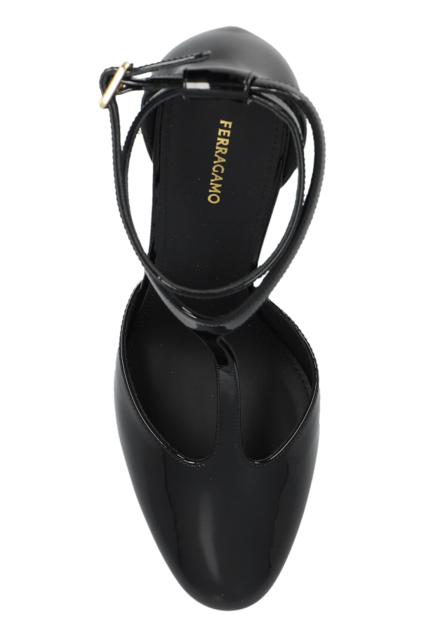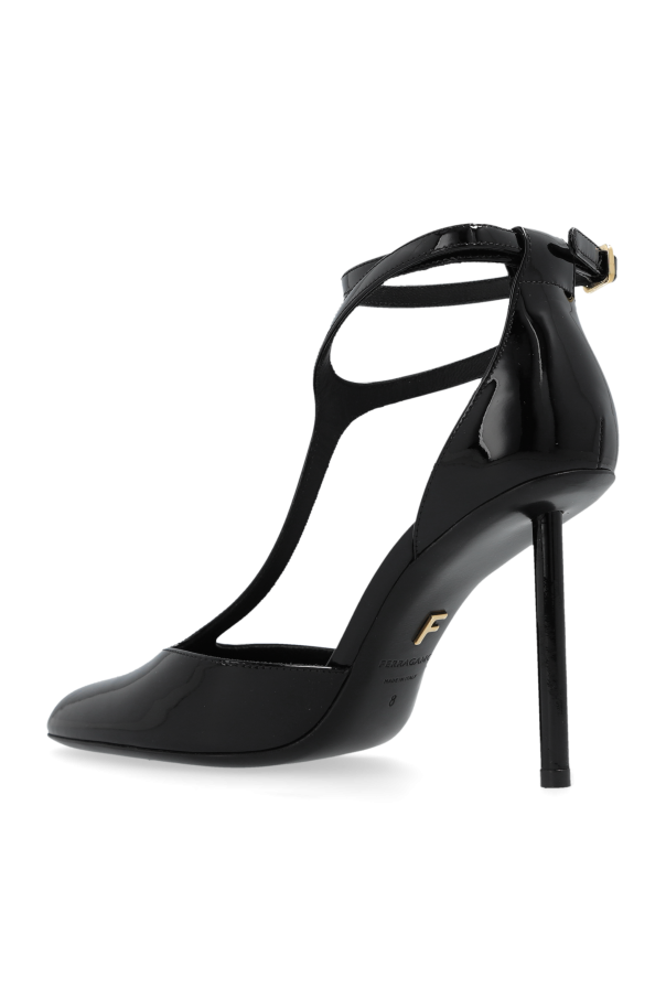 Introducing the exquisite Lusandra high heels by the renowned fashion house, Ferragamo. These captivating shoes epitomize sophistication with their elegant, classic shape featuring a closed toe and a T-strap design that gracefully extends from the front of the foot to the ankle strap. Crafted from lustrous, patent calf leather, the Lusandra heels boast a seamless, minimalist aesthetic, free from distracting patterns. The thin ankle strap, adorned with a petite gold buckle, ensures both stability and an elegant finish. The high, slender stiletto heel not only elongates the silhouette but also adds a touch of femininity to the overall look. Adding to their allure, the insoles proudly display the gold Ferragamo logo, signifying the shoes' luxurious heritage. Their timeless black color makes them a versatile addition to any wardrobe, effortlessly complementing various outfits and styles. The carefully contoured insole and well-balanced heel guarantee comfort, even with extended wear. Why Choose This Product? Crafted from premium patent calf leather for a luxurious feel. Elegant T-strap design with a chic gold buckle. High stiletto heel that enhances the feminine silhouette. Iconic gold Ferragamo logo on the insole. Timeless black color for maximum versatility. Comfortable, contoured insole and balanced heel.