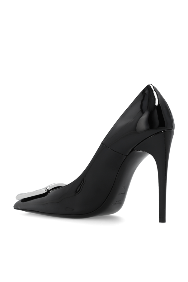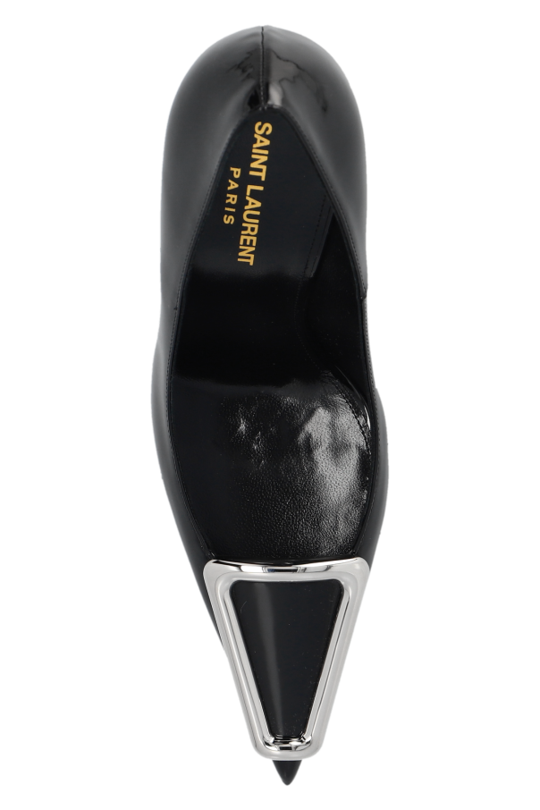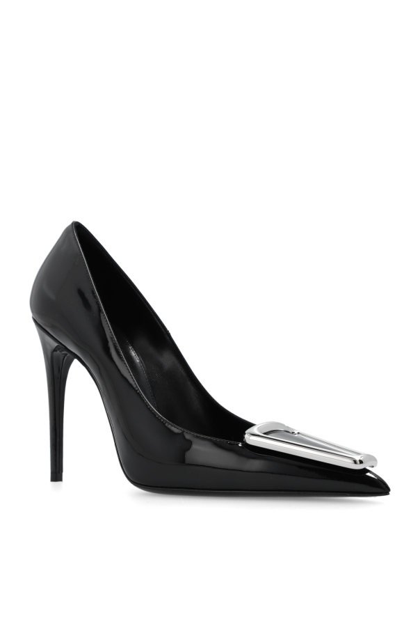 Black ‘Avenue’ stiletto pumps from Saint Laurent. Crafted from patent calf leather, this pair features a silver-tone brass detail, pointed toe and black leather sole.
