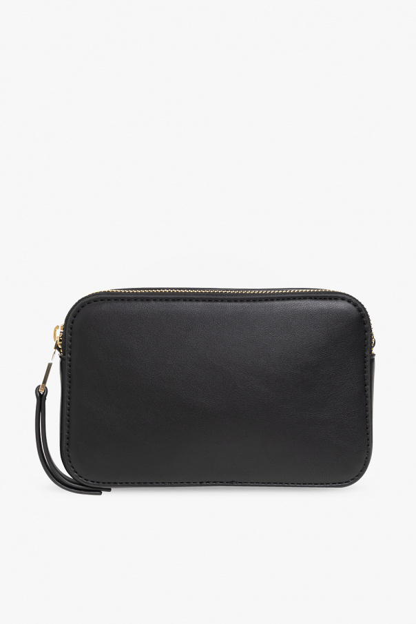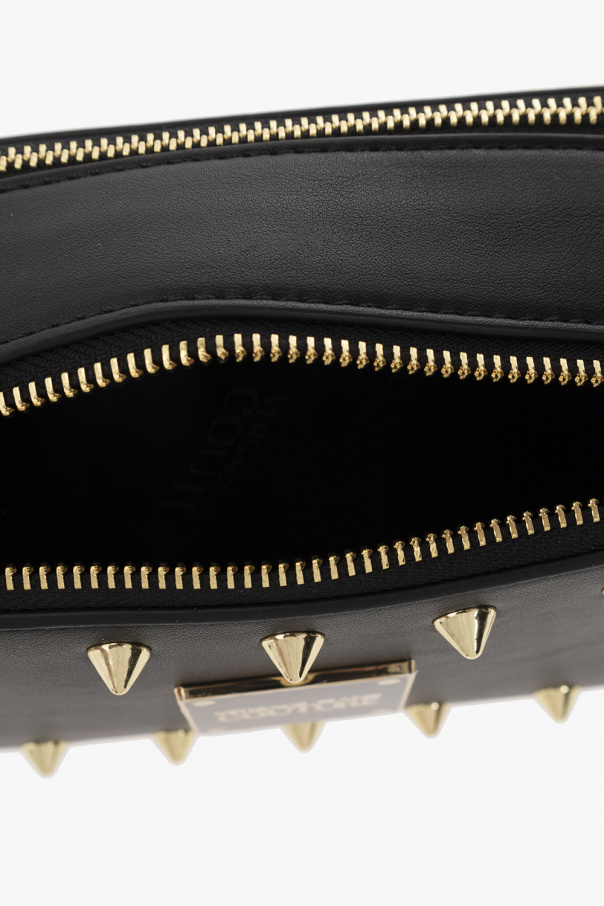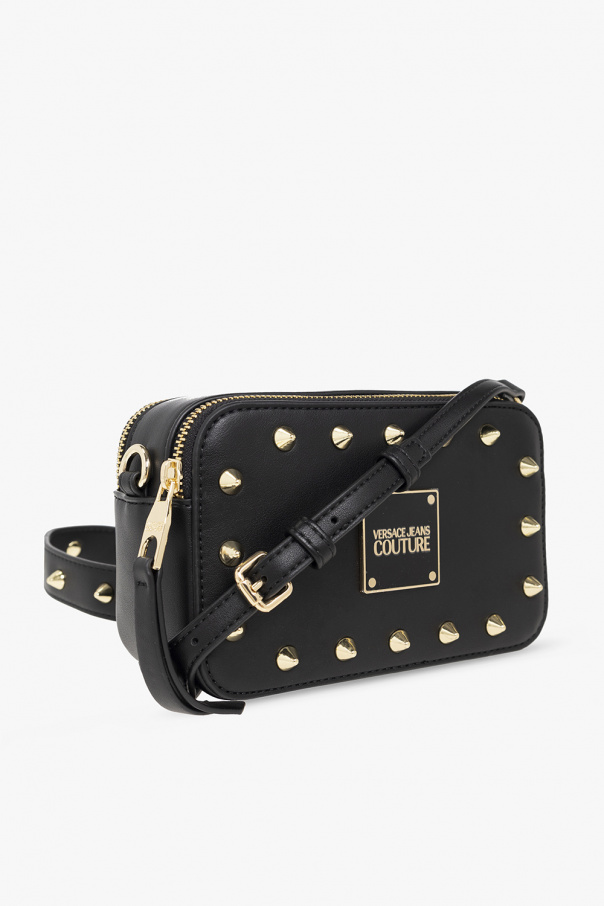 Black shoulder bag from Versace Jeans Couture. Crafted from faux leather, this model is complete with a zip fastening, studs, metal logo appllique, detachable and adjustable studded shoulder strap, gold-tone metal hardware and two separate internal compartments with one slip pocket.
