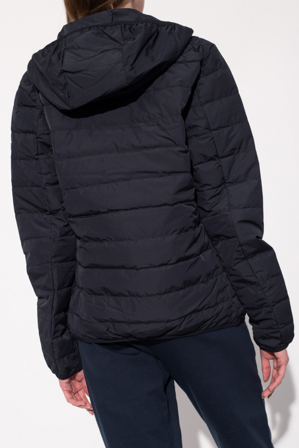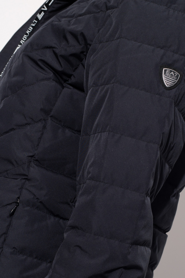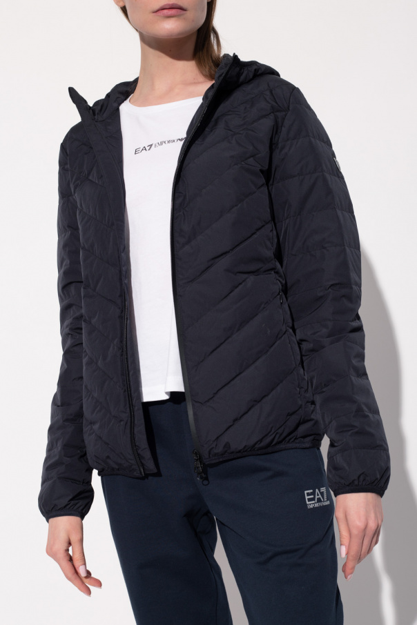 Black down jacket with a hood from EA7 Emporio Armani. Emblazoned with a branded sleeve patch, this style features a two-way zip fastening, two frontal pockets with hidden zippers and elasticized trims on the bottom hem and cuffs.