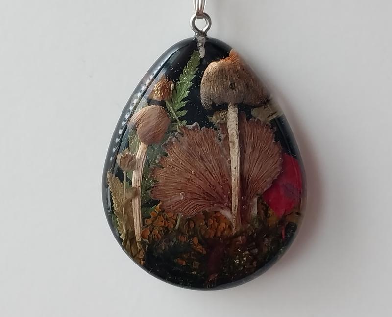 Кулон у вигляді краплі, великий, розміри 42х38 мм, де на чорному фоні 3 справжні сухі грибочки, листок папороті, мох, червоний осінній лист та інші рослини - маленький шматочок реального лісу, збережений у смолі!