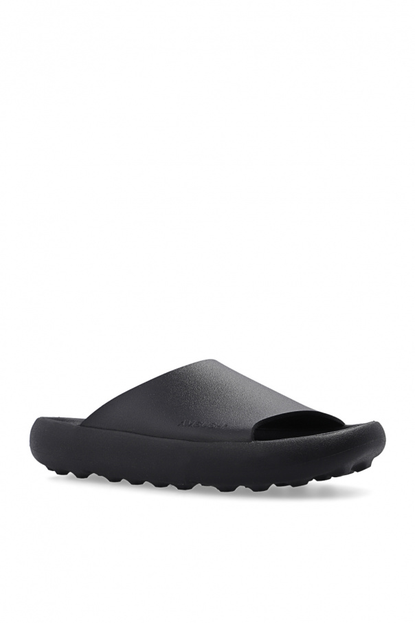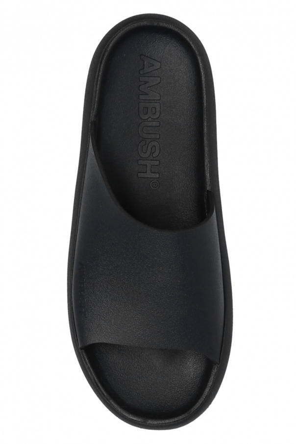 Black slides from Ambush. Made of rubber, this pair features a raised logo and black rubber sole.