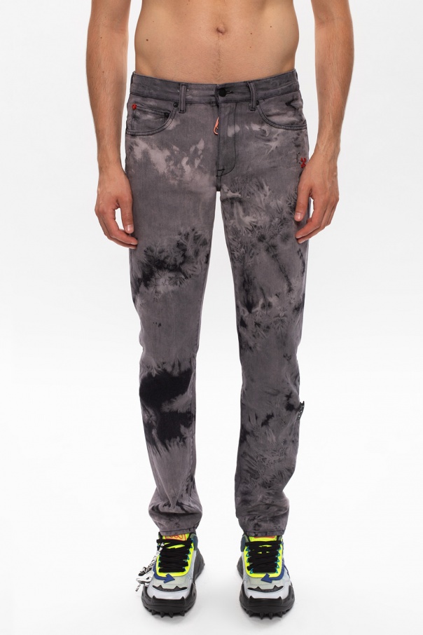 Grey jeans from Off-White. Rendered in a tie dye effect, this pair was cut from cotton and falls down with straight legs. It also features zip fly with button fastening, five pockets as well as red metal plaque with the label's logo on the front and a light green patch on the back.