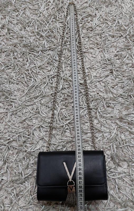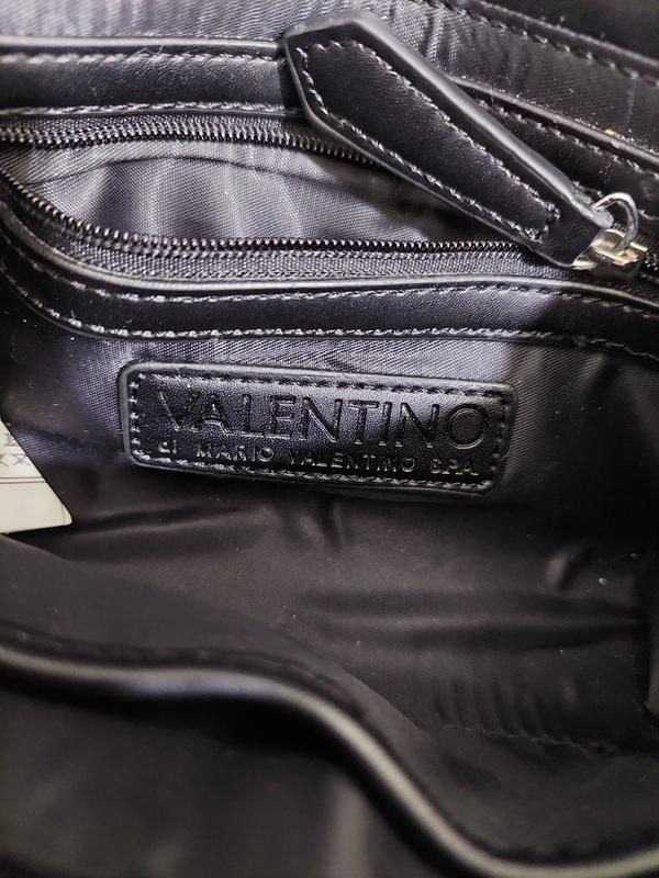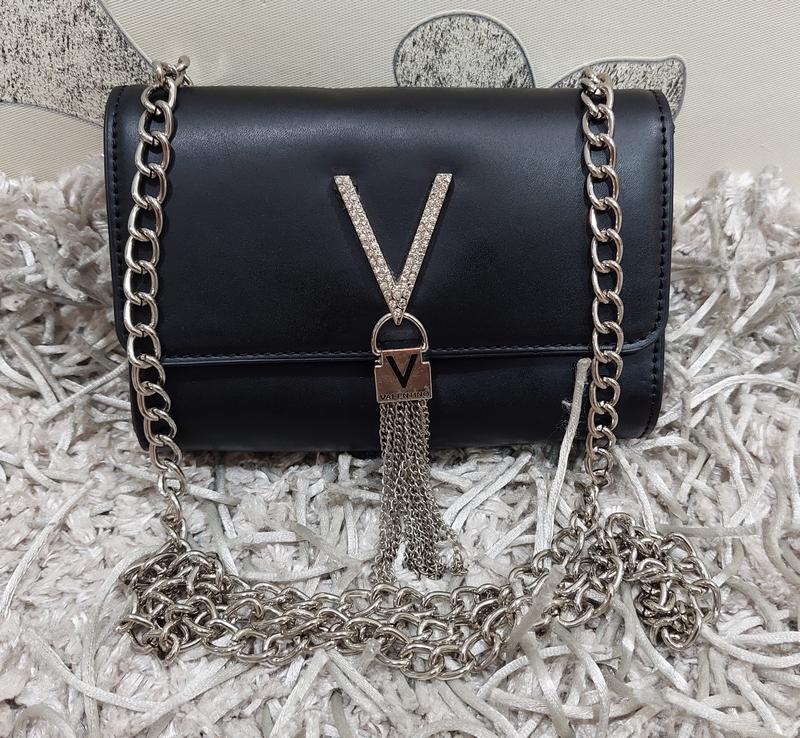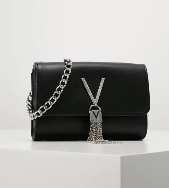 Маленькая черная сумочка Valentino с серебряными кристаллами логотипа. Имеет один небольшой внутренний карман на молнии и один откритий.