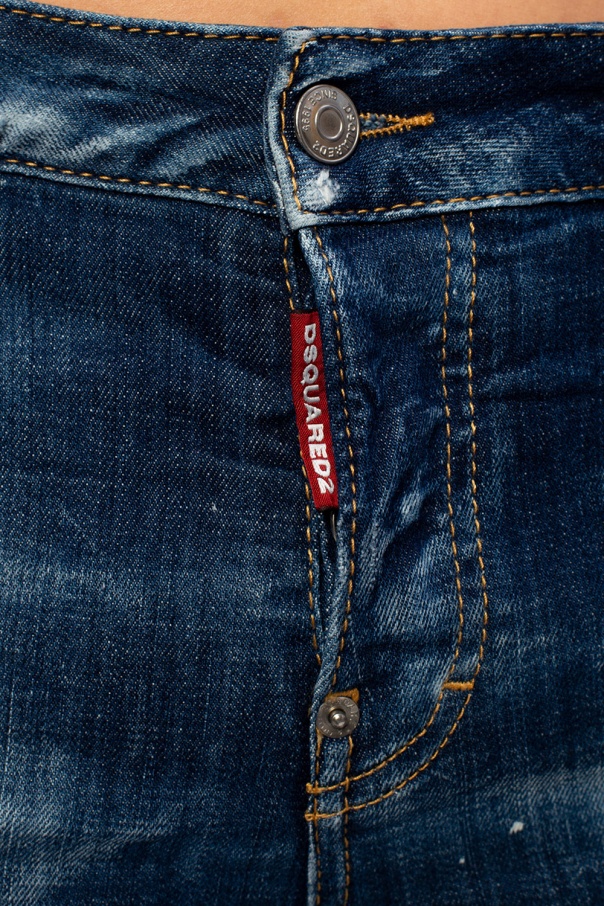 Navy ‘Cool Girl Jean’ distressed jeans from Dsquared2. Fastened with buttons, this tapered leg design is decorated with a white paint splatter effect.