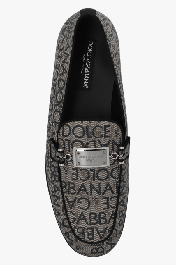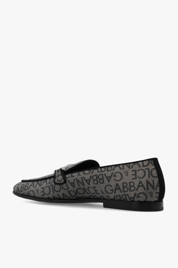 Greyish beige and black loafers from Dolce & Gabbana. Made of fabric with an embroidered monogram and leather trims, this pair features a metal logo-engraved detail in silver-tone and black leather sole.