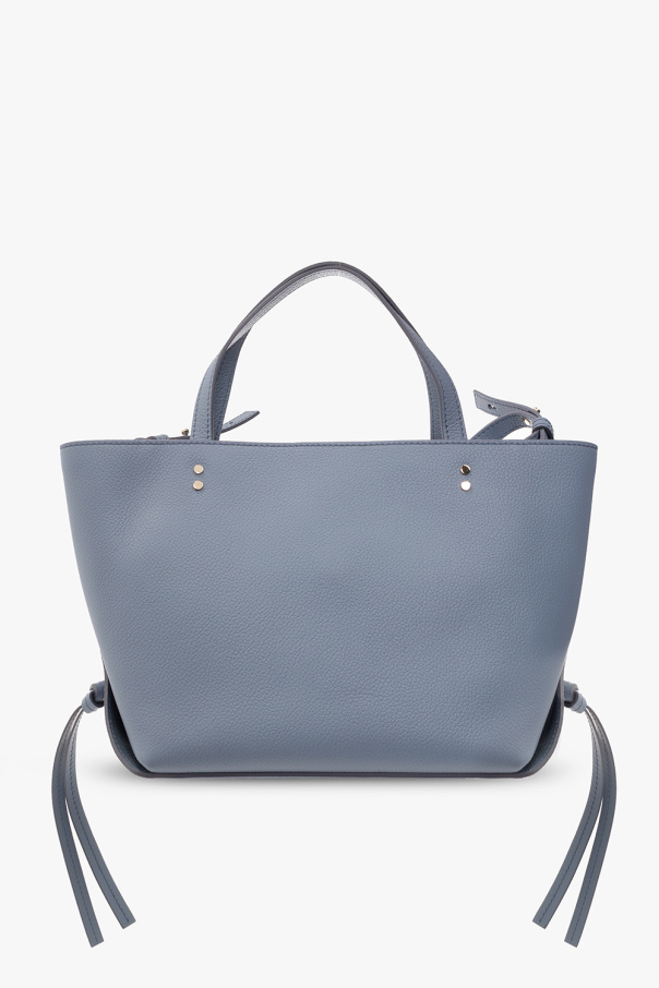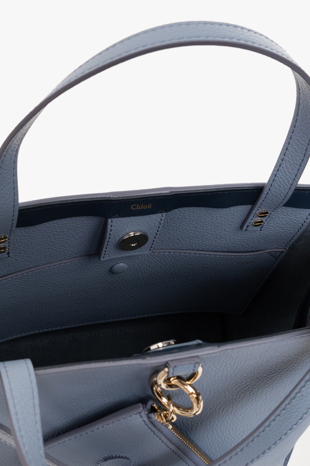 Blue ‘Chloé Sense Small’ shopper bag from Chloé. Made of calf leather, this model fastens with snaps and is complete with tassels on the sides, two half-round handles, detachable and adjustable shoulder strap, light gold-tone metal hardware and one internal compartment with a snap-fastened pocket. Comes with a detachable zipped pouch with a logo embroidery.