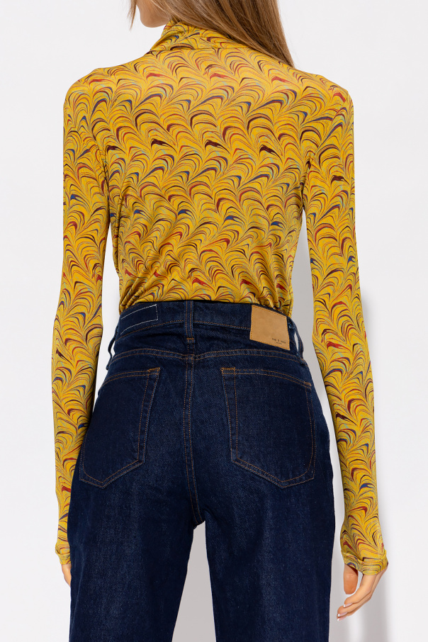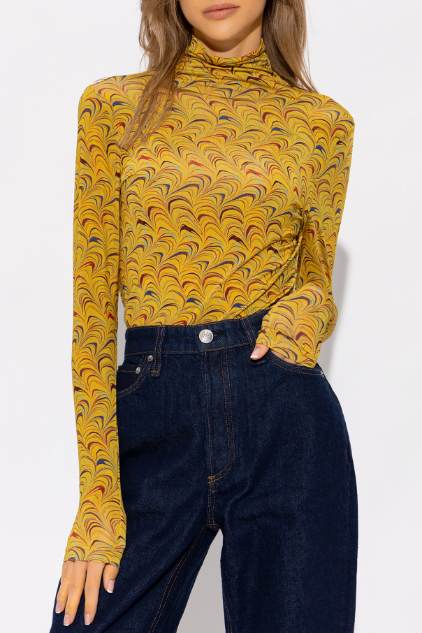 Yellow ‘Aurelia’ turtleneck sweater from Ulla Johnson. Crafted with a form-fitting silhouette, this style features a colourful pattern, long sleeves and a snug collar.