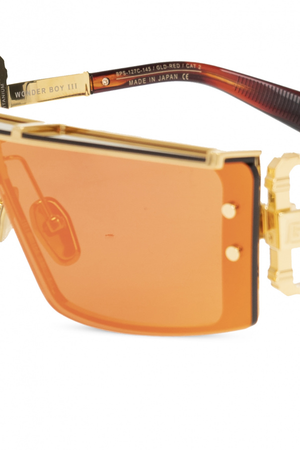 Gold-tone and brown ‘Wonder Boy III’ sunglasses from Balmain. Made of titanium, this pair features temples with a transparent insert with a monogram pattern as well as reddish orange shaded anti-glare lenses with a mirror effect and 100% UV protection. Case included.
