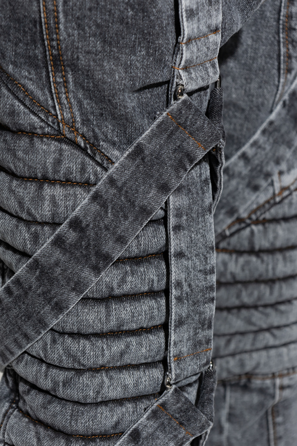 Dark grey jeans from Balmain. Made of cotton, this pair features a silver-tone zip, logo patch at the back, two front pockets, two zipped back pockets and quilted, tapered legs with decorative straps.