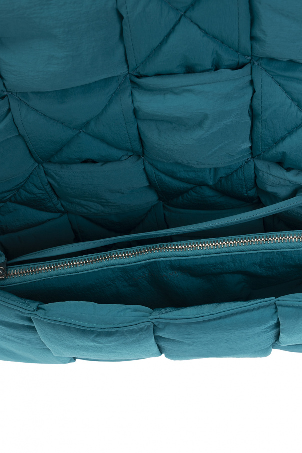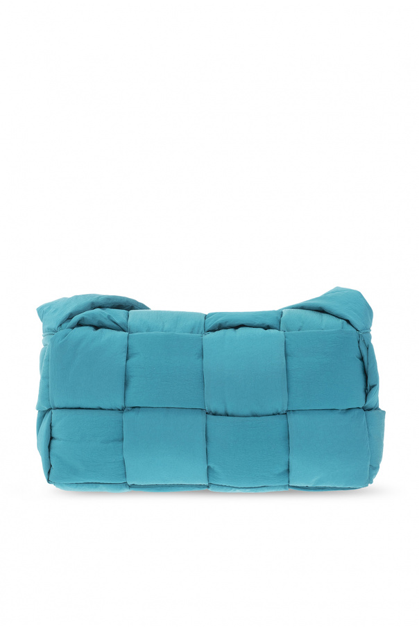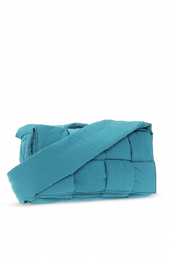 Bluish green ‘Padded Tech Cassette Medium‘ shoulder bag from Bottega Veneta. This model features a flap with magnetic snaps, the brand’s signature Intrecciato weave, adjustable shoulder strap, silver-tone metal hardware and one internal compartment with a zipped pouch on a strap.