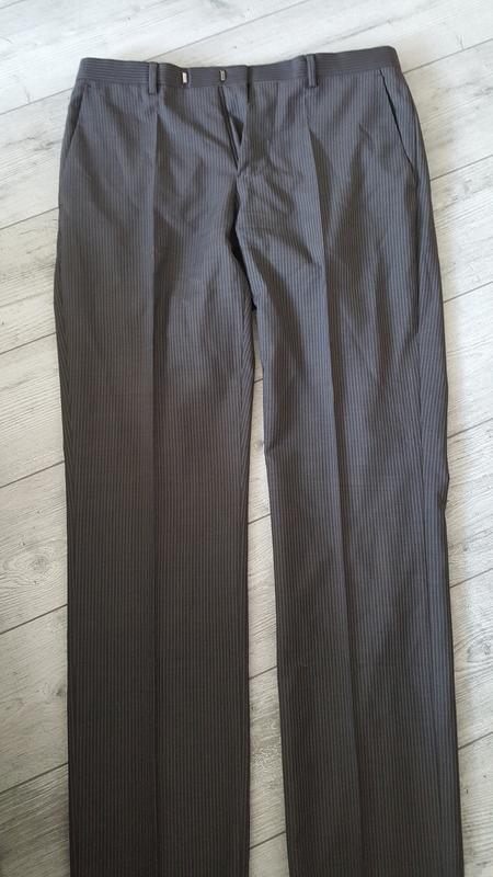 Костюм двойка из тонкой натуральной шерсти Hugo Boss. Зазубренные лацканы, застежка на пуговицах спереди, два передних кармана с клапанами, длинные рукава, манжеты на пуговицах, прорезной карман на груди. Приталенный пиджак и слегка удлиненный. Качественная ткань в мелкую полоску, красивый серо-коричневый цвет. У брюк застежка на молнию и пуговица спереди, петли для ремня, два прорезных кармана по бокам и карман на пуговице сзади.