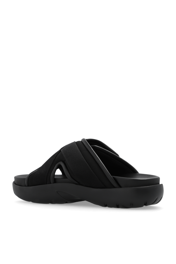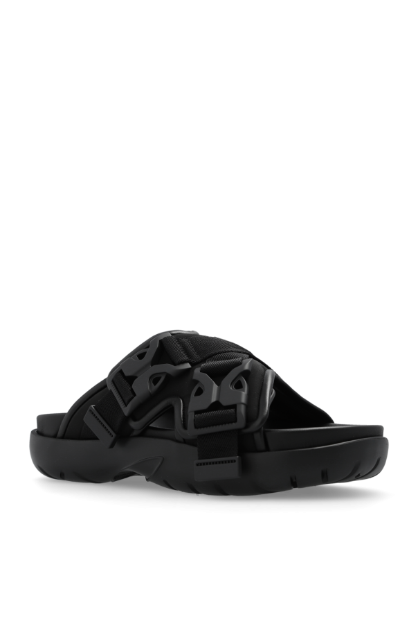 Black ‘Snap’ slides from Bottega Veneta. Crafted in part from recycled material, this model sits on a black rubber sole and features crisscross straps with buckles.
