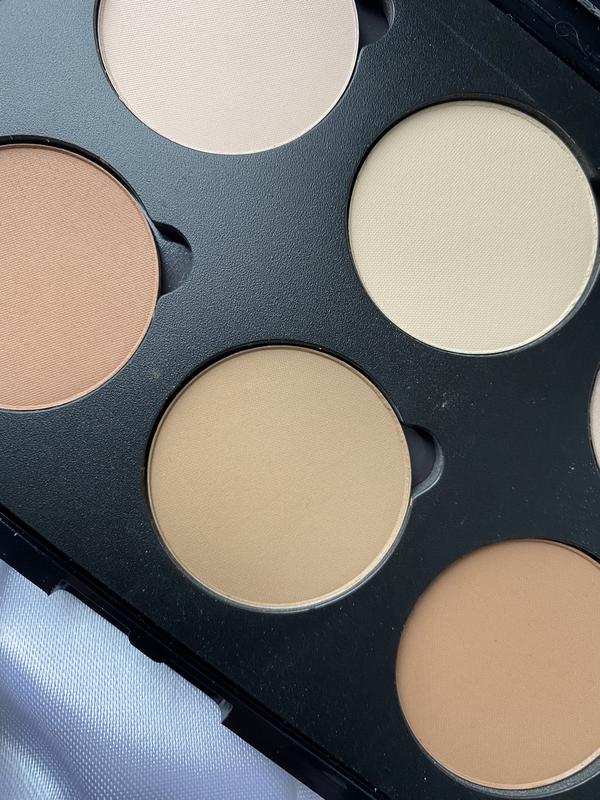 Включает 2 оттенка пудры, хайлайтер, скульптор с правильным, холодным, серо- коричневым оттенком, два бронзера.