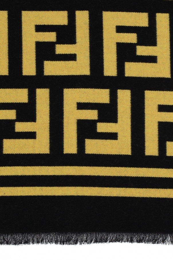 Yellow and black scarf from Fendi. Knitted from wool, this premium quality accessory showcases emblematic logo motif and raw, frayed edges.
