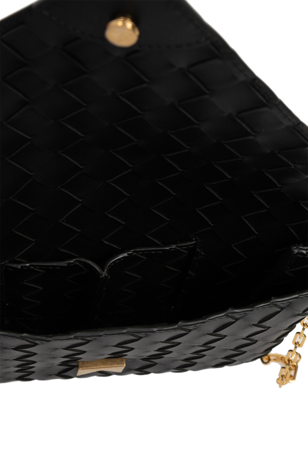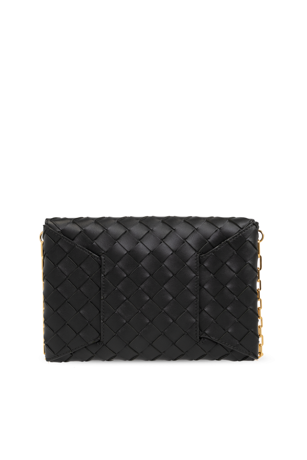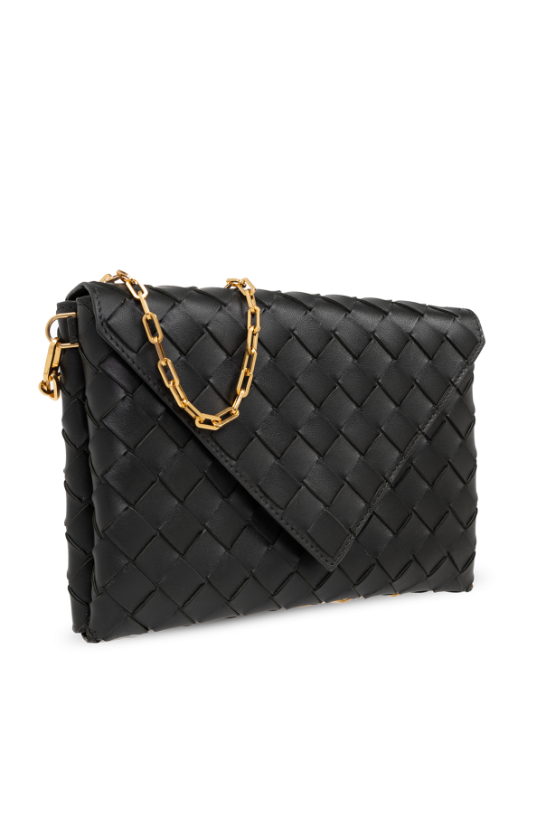 Black ‘Origami’ clutch from Bottega Veneta. Crafted from leather with the iconic Intrecciato weave, this item features a hook closure, detachable chain, one internal compartment and gold-tone metal hardware.