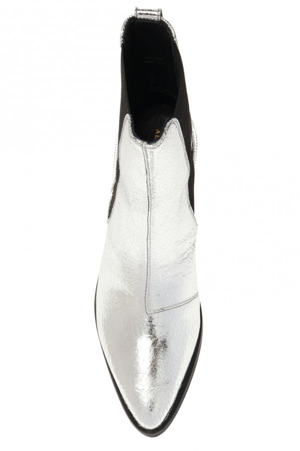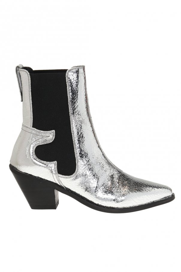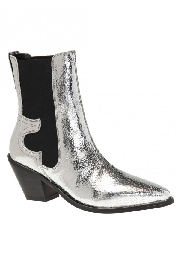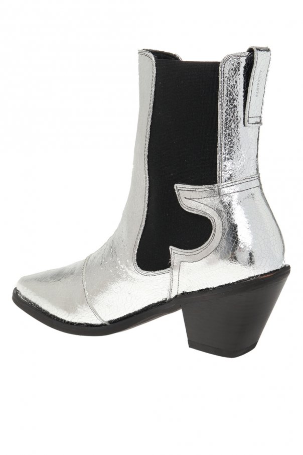Silver-tone and black ‘Sara’ slip-on cowboy boots from AllSaints. Made of cow leather. Black rubber sole.