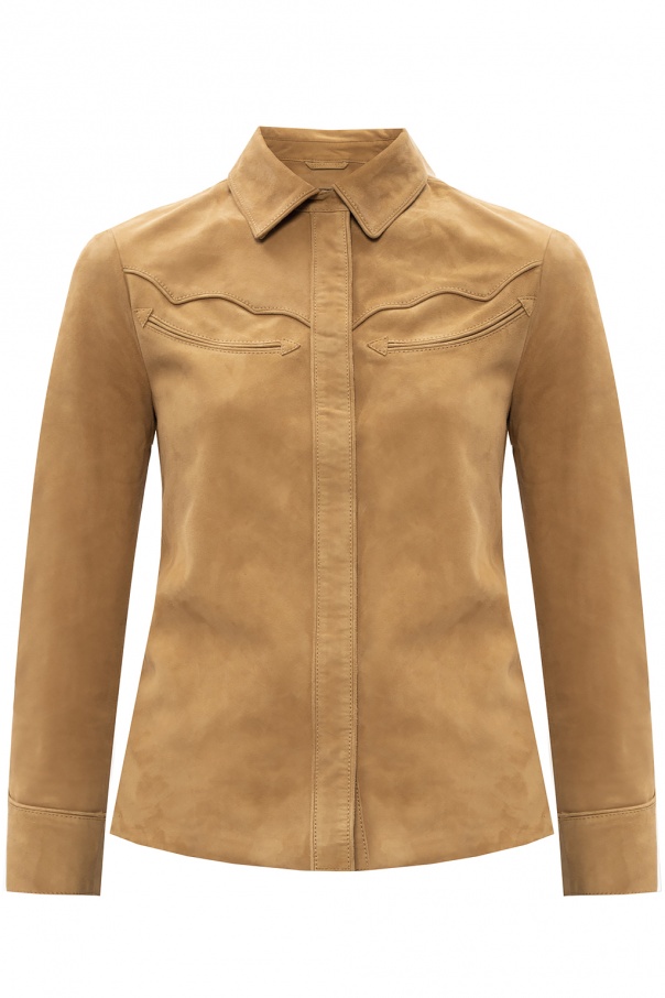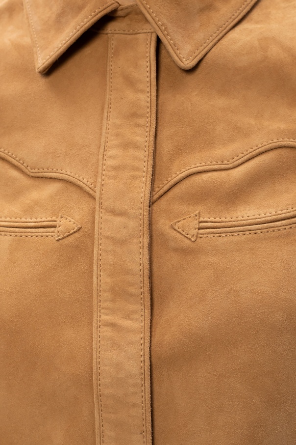 Light brown ‘Oakley’ shirt from AllSaints. Cut from suede, this item fastens via press-studs with a concealed placket and features distinctive panel stitching.